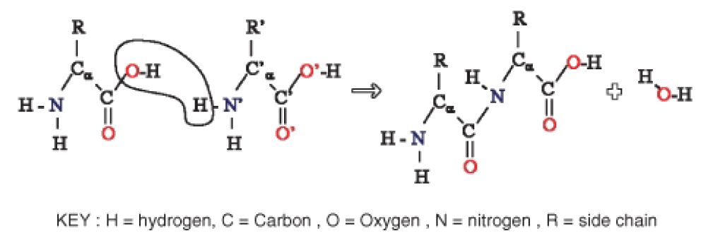 Figure 6: In this dehydration reaction, two amino acids form a peptide bond. A water molecule also forms.