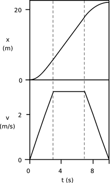 Figure aa: Graphs of xand v versus t for a car accelerating away from a traffic light, and then stopping for another red light.