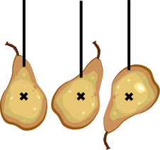Figure e: No matter what point you hang the pear from, the string lines up with the pear's center of mass. The center of mass can therefore be defined as the intersection of all the lines made by hanging the pear in this way. Note that the X in the figure should not be interpreted as implying that the center of mass is on the surface --- it is actually inside the pear.