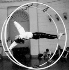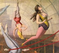 Figure f: The circus performers hang with the ropes passing through their centers of mass.
