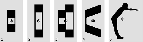 The center of mass is a sort of average, so the height of the centers of mass in 1 and 2 has to be midway between the two squares, because that height is the average of the heights of the two squares. Image 3 is a combination of examples 1 and 2, so we can find its center of mass by averaging the horizontal positions of their centers of mass. In image 4, each square has been skewed a little, but just as much mass has been moved up as down, so the average vertical position of the mass hasn’t changed. Image 5 is clearly not all that different from image 4, the main difference being a slight clockwise rotation, so just as in image 4, the center of mass must be hanging in empty space, where there isn’t actually any mass. Horizontally, the center of mass must be between the heels and toes, or else it wouldn’t be possible to stand without tipping over.