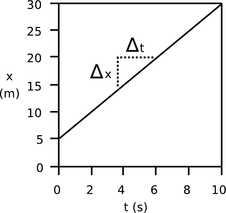 In algebra notation, we'd say that the graph of x vs. t shows the same change in position, \(\Delta{}\)x = 5.0 m, over each interval of \(\Delta{}\)t = 2.0 s. The object's velocity or speed is obtained by calculating v = \(\Delta{}\)x / \(\Delta{}\)t = (5.0 m)/(2.0 s) = 2.5 m/s. In graphical terms, the velocity can be interpreted as the slope of the line. Since the graph is a straight line, it wouldn't have mattered if we'd taken a longer time interval and calculated v = \(\Delta{}\)x/ \(\Delta{}\)t = (10.0 m)/(4.0 s). The answer would still have been the same, 2.5 m/s.
