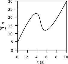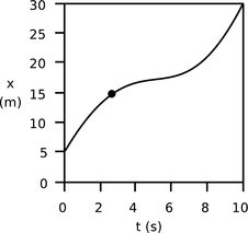 Figure q is similar to Figure o in that the object moves a total of 25.0 m in a period of 10.0 s, but it is no longer true that it makes the same amount of progress every second. There is no way to characterize the entire graph by a certain velocity or slope, because the velocity is different at every moment. It would be incorrect to say that because the car covered 25.0 m in 10.0 s, its velocity was 2.5 m/s. It moved faster than that at the beginning and end, but slower in the middle. There may have been certain instants at which the car was indeed going 2.5 m/s, but the speedometer swept past that value without "sticking," just as it swung through various other values of speed.