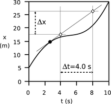 First we draw the tangent line through that point. To find the slope of the tangent line, we need to pick two points on it. Theoretically, the slope should come out the same regardless of which two points we pick, but in practical terms we’ll be able to measure more accurately if we pick two points fairly far apart, such as the two white diamonds. To save work, we pick points that are directly above labeled points on the t axis, so that t = 4.0 s is easy to read off. One diamond lines up with x \(\approx{}\) 17.5 m, the other with x\(\approx{}\)26.5 m, so x = 9.0 m. The velocity is \(\Delta{}\)x/\(\Delta{}\)t = 2.2 m/s.