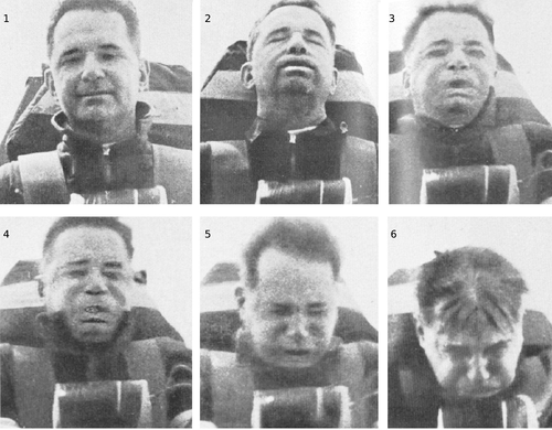 Figure u: This Air Force doctor volunteered to ride a rocket sled as a medical experiment. The obvious effects on his head and face are not because of the sled's speed but because of its rapid changes in speed: increasing in 2 and 3, and decreasing in 5 and 6. In 4 his speed is greatest, but because his speed is not increasing or decreasing very much at this moment, there is little effect on him.