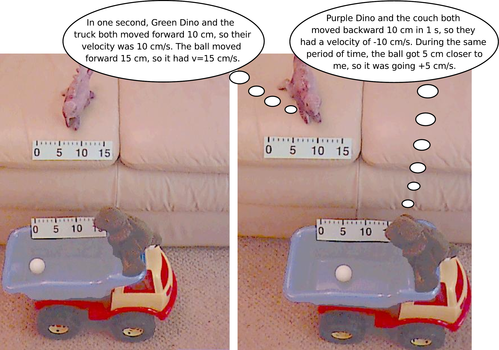 Figure y: These two highly competent physicists disagree on absolute velocities, but they would agree on relative velocities. Purple Dino considers the couch to be at rest, while Green Dino thinks of the truck as being at rest. They agree, however, that the truck's velocity relative to the couch is \(v_{TC}\)=10 cm/s, the ball's velocity relative to the truck is \(v_{BT}\)=5 cm/s, and the ball's velocity relative to the couch is \(v_{BC}\)= \(v_{BT}\) + \(v_{TC}\) = 15 cm/s.
