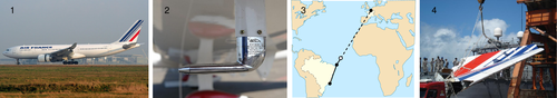 Figure z: 1. The aircraft before the disaster. 2. A Pitot tube. 3. The flight path of flight 447. 4. Wreckage being recovered.