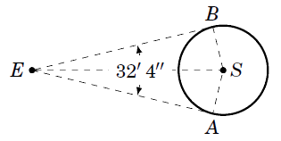 Solution: Let the point E be the earth and let S be the center of the sun. The observer’s lines of sight to the visible edges of the sun are tangent lines to the sun’s surface at the points A and B. Thus, \(\angle\)EAS = \(\angle\)EBS = 90º. The radius of the sun equals AS. Clearly AS = BS. So since EB = EA (why?), the triangles ∆EAS and ∆EBS are similar. Thus, \(\angle\)AES = \(\angle\)BES = \(\frac{1}{2}\) \(\angle\)AEB = \(\frac{1}{2}\) (32′ 4′′) = 16′ 2′′ = (16/60)+(2/3600) = 0.26722º.