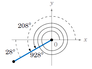 Solution: (a) Since 928º = 2×360º +208º, then θ has the same terminal side as 208º, as in Figure 13.