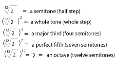 Figure 4: In equal temperament, the ratio of frequencies in a semitone (half step) is the twelfth root of two. Every interval is then simply a certain number of semitones. Only the octave (the twelfth power of the twelfth root) is a pure interval.