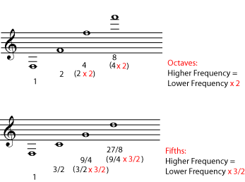 Figure 6: Remember that, no matter what note you start on, the note one octave higher has 2 times its frequency. Also, no matter what note you start on, the note that is a perfect fifth higher has exactly one and a half times its frequency. Since each of these intervals is so many "times" in terms of frequencies, when you add intervals, you multiply their frequencies. For example, a series of two perfect fifths will give a frequency that is 3/2 x 3/2 (or 9/4) the beginning frequency.